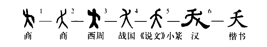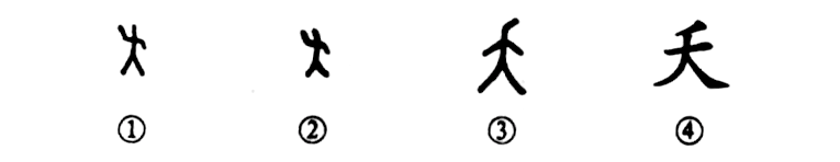 這個“夭”字是個象形字。甲骨文①像一個人彎曲兩臂。金文②的形體也基本上同于甲骨文。小篆③則把彎曲的兩臂之形改為向右歪頭。④是楷書的寫法,把歪頭狀改為一撇,這是為了符合漢字的筆形要求和書寫方便而改動的。