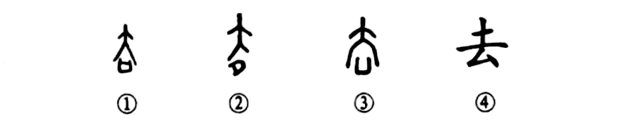 “去”字可能有兩個來源。其一,象形字。像盛器,下體之“口”像器,上體之“大”像蓋兒,是“凵盧”(????)一詞的象形初文,本義是有蓋兒的盛食器(參見“凵”字條)。其二,從大從口,結構之意不明,詞本義未知(學者或視作以“開口”為義的“呿”字初文)。以上二字在商周時代已經混同一形。至西周中期,二元混同的“去”字下體“口”已多省去上橫而成“凵”形,至東漢,變作三角形,進而變作“厶”形。“去”字上體的“大”形,在戰國楚系文字里中豎訛斷,成為上下相疊的兩個“人”形,這在秦簡及西漢馬王堆、銀雀山簡帛中都有表現,但秦后隸變的主流形式是把“大”形變作“土”形。《說文》:“去,人相違也。”違離、離開義使用頻率高,占據了混同合一的“去”字。《詩·大雅·生民》:“鳥乃去矣,后稷呱矣。”由離開的使動義引申為去掉、除去。由離開義還引申為放棄、失掉和距離,引申為往,即離開此地而至于彼地。而以盛食器為義的“去”在漢代字書和詞書中寫作加“竹”標義的“??”,典籍上一般用后起形聲字“筥(jǔ)”。《詩·周頌·良耜》:“或來瞻女(汝),載筐及筥,其餉伊黍。”引申為收藏,后來用增從“廾”的“弆”字。另引申為器蓋兒,用增從“皿”的“盍”字(參見“盍”字條)。(金國泰)