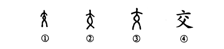 這個“交”字是個象形字。甲骨文①像正面站著一個人,兩脛相交叉。金文②和小篆③也是這個樣子。④是楷書的寫法。