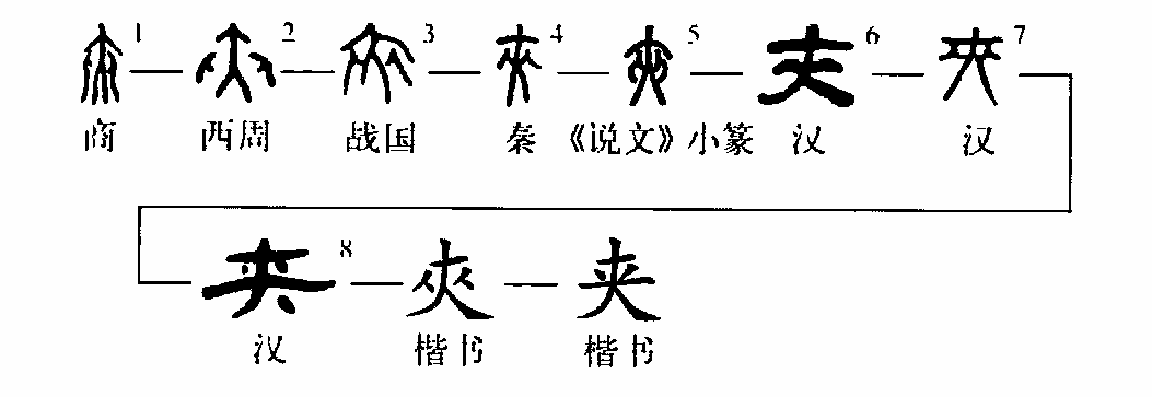 會意字。從大,從二人,從左右二人攙扶中間一人會意。古今字形均作“大”下兩“人”。現代漢字簡化時,據漢代草書將“夾”簡作“夾”。本義為挾持、從左右相持,讀作jiā。《說文》:“夾,持也。”《儀禮·既夕禮》:“薦馬纓三就,入門,北面,交轡(pèi,韁繩),圉人(養馬之人)夾牽之。”《墨子·雜守》:“守大門者二人,夾門而立。”由挾持引申為扶持、輔佐。也指從兩個相對的方向向內用力,使物體固定不動,引申指夾東西的器具。由從左右扶持義引申為在兩邊的、左右相對的、摻雜等義。“夾”由二人挾持一人引申指里外兩層,如“夾衣”、“夾褲”,這一意義后又作從“衣”、“夾”聲的“裌”及從“衣”、“合”聲的“袷”,讀作jiá,現代漢字整理時,已將“裌”“袷”二字作為“夾”的異體字淘汰。又讀作xié,用作“挾”的通假字;又讀作xiá,用作“狹”的通假字;還讀作gā,用于“夾肢窩”一詞。(郭小武 葉青)