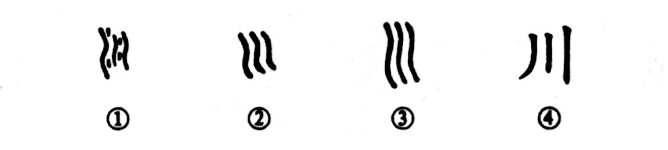 這是“百川灌河”的“川”字。甲骨文①彎彎曲曲的形狀像一條河流,曲線中的四個(gè)點(diǎn)兒是指河流中的漩渦。所以“川”字是個(gè)象形字,它的本義就當(dāng)河流講。金文②則把水中的“點(diǎn)兒”去掉了,這是為了書寫方便。③是小篆形體,同于金文。④是楷書的形體。