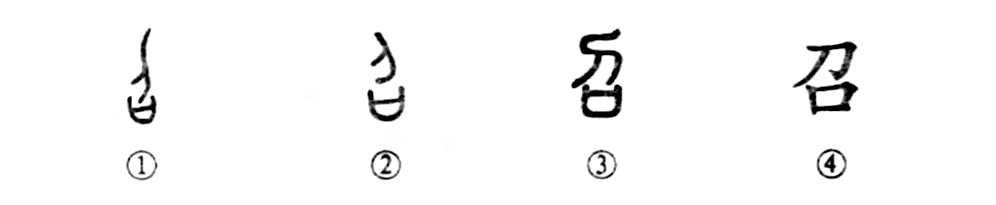 這個“召”字本為形聲字。①是甲骨文的形體,上部是刀形,表聲,下部是“口”,表示呼喚或打招呼。②是金文的形體,與甲骨文基本相同。③是小篆的形體。④為楷書的寫法。前后一脈相承。
