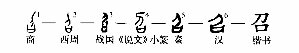的繁體。戰國以后,召逐漸取代??。召公之召舊讀為shào,本是召公奭的采邑,文獻中或作“邵”,地名字加邑旁,后以地為氏。(陳英杰)