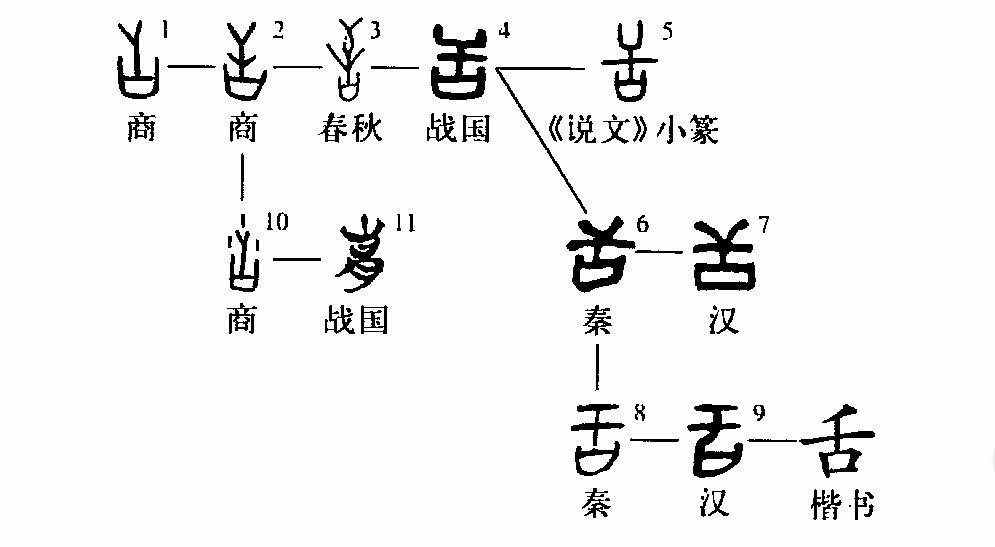 象形字。《說文》:“舌,在口,所以言也,別味也。從干,從口,干亦聲。”像舌自口出。甲骨文異體兩旁的點像唾液。許慎以為“從干,從口”會意,不確。舌字在??鐘銘文中有所訛變,上部與倒寫的“矢”字近似。戰國楚簡中“舌”字增加表意偏旁“肉”,構成異體。“舌”是個常用字,所記錄的常用義自甲骨文至今都是“舌頭”。在構字中,作為聲旁的“舌”多是“??”的簡化,如“適”、“話”等等,與舌頭之“舌”僅是同形。(李守奎)
