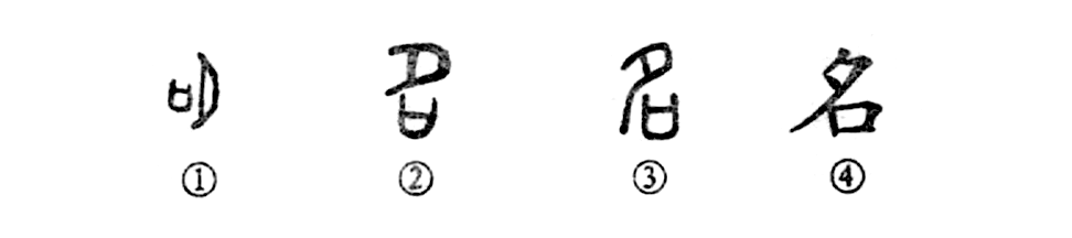 “名下無虛士?!边@個“名”字,本為會意字。甲骨文①的左邊是“口”,右邊是“夕”。甲骨文中的“夕”與“月”本為一個字。唐蘭先生認為,這就表明在月下說話的意思。也可以說是在月下呼喚名字。②是金文的形體,變作月下有口,其義未變。③是小篆的形體。④是楷書的寫法。
