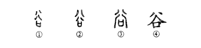 這是“山鳴谷應”的“谷”字,原為會意字。①是甲骨文的形體,上部是水形,下部是水的出口處,表示泉水從泉眼流出。②是金文的形體,與甲骨文相同。③是小篆的形體。④為楷書的寫法。