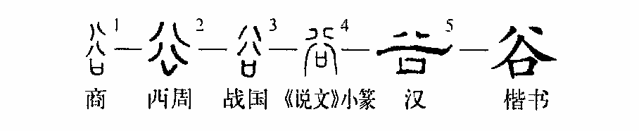 會意字。甲骨文字形下面像谷口,上面像水流出。甲骨文上邊是兩個八字,下邊是口形。金文與甲骨文略同。小篆字形規整勻稱,下面八字變形。隸書、楷書筆畫化,近于金文。本義是兩山之間的水流。《淮南子·說山》:“江河所以長百谷者,能下之也。”從本義引申指兩山中間的低洼地,如山鳴谷應。從兩山間的低洼地引申比喻困難。《詩·大雅·桑柔》:“進退維谷。”谷假借為“穀”。“穀”本是莊稼和糧食的總稱。漢陸賈《新語·慎微》:“棄二親,捐骨肉,絕五谷,廢《詩》、《書》,背天地之寶,求不死之道。”(馮華)
