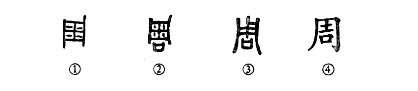 這是“周而復始”的“周”字,本為象形字。甲骨文①就像在玉片上雕刻的花紋。②是金文的寫法,其下增加了“口”,可能系裝飾部分。③是小篆的形體,直接由金文演變而來。④為楷書的寫法。