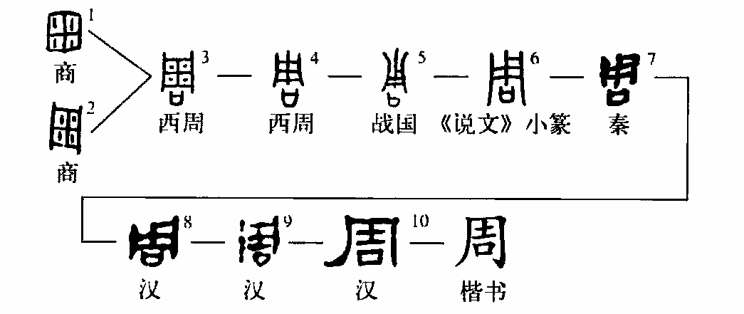 “周”初作,本為象形字,但構形不明。有學者認為字像方格縱橫、刻畫文采之形,為“彫”之初文;或曰字像界劃分明之農田,其中小點像禾稼之形。《說文》訓為“密也”,義即周匝、周密。諸說均迂曲難信。甲骨文中用為方國名,金文中即指姬周。《說文》分析“周”字字形為“從用、口”,“口”至西周時始附加,可能是用來專表姬周的區別性義符,字初作