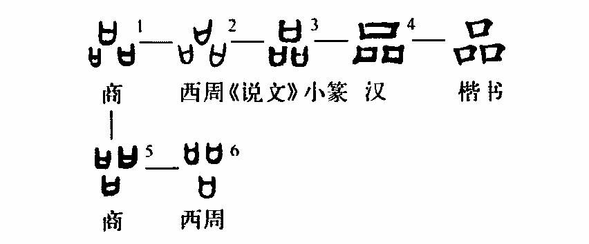 會意字。《說文》:“品,眾庶也。”本義是人的多數,以“口”表示人,三“口”表示人的眾多,與“眾”字表示“人”的眾多構字原理相同。邢侯簋:“錫(賜)臣三品:州人、重人、郭人。”這里的“臣三品”就是指居住在州、重、郭的人的共同體。“品”的意義也就相當于現代漢語的“人口”。《易·乾》中“品物流形”中的“品”,已經是“人的多數”這一本義的引申——“眾多”了。在文字結構上,甲骨文與金文都有“品”和“”兩種形體,至秦漢才定形為上部一“口”,下部兩“口”的結構形體。但“口”形在隸書中分化成“