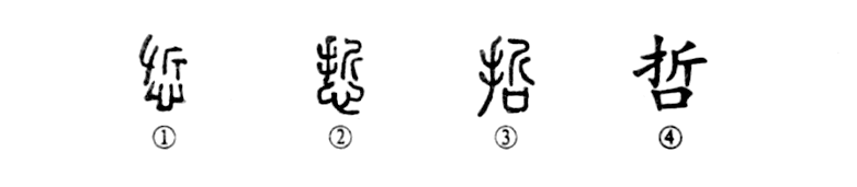 這是“知人則哲”的“哲字”,本為形聲字。①是金文的形體。其上部為“折”,表音,下部為“心”,表意,表示“聰明”之意。②是小篆的形體,直接由金文變來。③為小篆的異體字,將“心”換成“口”,其義未變。④為楷書的寫法。