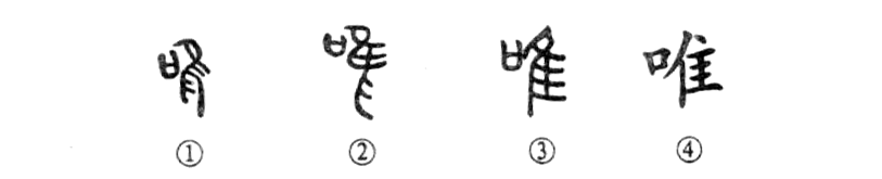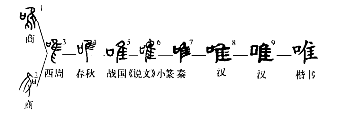 這個“唯”字,本為會意兼形聲的字。①是甲骨文的形體,右邊像一只鳥形,左邊為一“口”,原表示鳥鳴之聲。②是金文的形體。③是小篆的形體。④是楷書的形體。從形體上看,一脈相承。