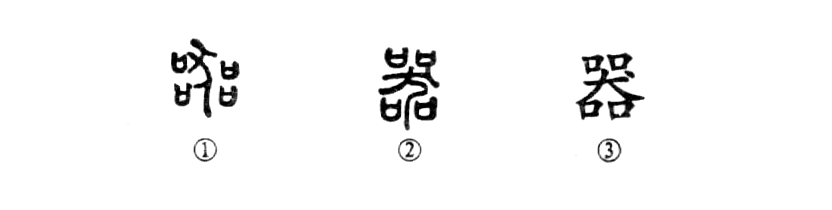 “玉不琢,不成器?!边@個“器”字本為會意字。①是金文的形體,四邊有四個“口”,中間為“犬”。人喧嘩為“囂”,犬吠為“器”,所以“器”字應為“狺”(yín)字的初文。②是小篆的形體,與金文相似。③為楷書的寫法。