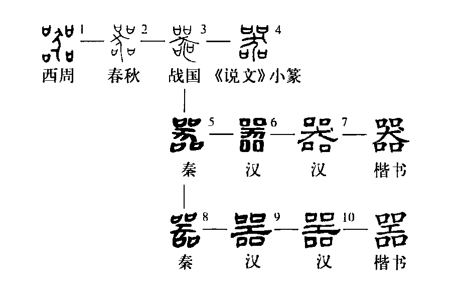 會意字。四“口”表示眾器物的口,“犬”守護著,以防丟失。本義就是“器具”。段玉裁說“器乃凡器統稱”是對的。不同質地、不同用途的器具都可稱為“器”,如“木器”、“金器”、“陶器”、“食器”、“酒器”、“兵器”等等。器之本義延用至今,古今寫法也變化不大?!捌鳌弊鳛楫愺w,見于《玉篇·?部》。(李守奎)