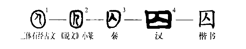 這個“囚”字很形象。從甲骨文①的形體看,周圍像個土坑或井形,中間是面朝右立著的一個人,人體周圍的點兒是表示難受得身上冒汗。這是把罪人或者俘虜關起來的意思。所以這就是“囚犯”的“囚”字,是個會意字。②是小篆的形體,方框中像一個面朝左而下彎腰的人,身上的汗點兒都去掉了。楷書③是由小篆形體變來的,其組成部分與小篆同。