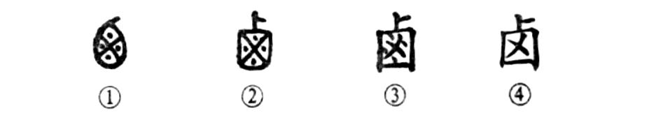 這個“鹵”字讀作lǔ,本為象形字。①是金文的形體,外部像裝鹽的容器,內部像裝滿了咸鹽。②是小篆的形體,與金文極為相似。③是楷書繁體字。④為簡化字。
