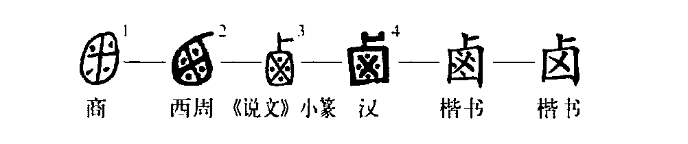 象形字。像盛鹽到容器之中。甲骨文中“”為容器,其中的“::”為鹽粒,鹽為細小顆粒,嫌與他物相混,因此,畫出盛它的容器。金文與甲骨文同。《簡化字總表》把“鹵”簡化成“鹵”,省略了原字中的四個點。本義為鹽鹵,又指制鹽時剩下的苦味汁液即鹽鹵。鹽鹵是氯化鎂和氯化鈉的混合物,黑色有毒,可使豆漿凝結成豆腐。后又泛指咸味的或不咸的濃汁。由本義引申為不生長谷物的鹽堿地。《史記?河渠書》:“穿洛以溉重泉以東萬余頃故鹵地。”(重泉:地名)又指鹽地所生的鹽粒。《史記?貨殖列傳》:“山東食海鹽,山西食鹽鹵。”通“魯”。笨,愚鈍。《莊子?則陽》:“君為政,焉勿鹵莽。”還可通“櫓”,大盾牌。通“擄”,掠奪。(胡偉)