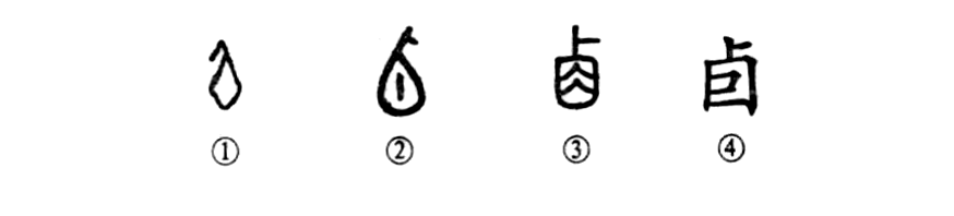 這個“卣”字讀作yǒu,本為象形字。甲骨文①就像一個酒器之形。這種酒器一般是用青銅制成,橢圓形,大腹小口,上有蓋和提梁。②是金文的形體。中間的一點,表示裝有酒漿之意。③是小篆的形體,似乎酒在器中晃動。④是楷書的寫法。