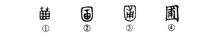 孔子在《論語》中說過:“吾不如老圃。”這是說,我不如種菜的老農(nóng)?!边@個“圃”字,我們從甲骨文①的形體看,其下部是眾多的方框菜田,其上部長出了兩棵菜苗。所以“圃”字的本義是種植蔬菜瓜果的園子。金文②則把甲骨文的形體簡化了一下,并在周圍加了個方框表示圍墻。到了小篆③則把其中的苗圃形偽變?yōu)椤案Α?這就變成了內(nèi)聲(甫)外形(囗)的形聲字“圃”了。楷書④則是直接由小篆的形體變來的,也是外形內(nèi)聲的形聲字。