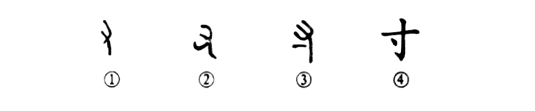 “相思不可寄,直在寸心中?!边@個(gè)“寸心”的“寸”字,比喻區(qū)區(qū)之心。其實(shí)“寸”字在甲骨文和金文中作偏旁用時(shí),與“又”(手)字并沒(méi)有什么區(qū)別。你看甲骨文①和金文②的形體就是“手”(又)形。③是小篆的形體,在手下之左側(cè)有一小橫,這是離手掌一寸的地方,就叫“寸口”(試脈處)。④是楷書(shū)的形體。