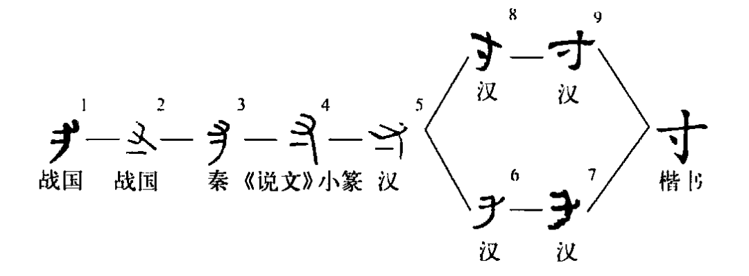 指事字。從又,從一。又為手之象,一是指事符號(hào),處在手下一寸之地的寸口處,指出此地是寸口所在,上距后腕一寸。戰(zhàn)國(guó)文字已見(jiàn)寸字,結(jié)構(gòu)與《說(shuō)文》相同。隸變時(shí),其結(jié)構(gòu)、筆形、筆序、筆劃均經(jīng)過(guò)多次調(diào)整。或?qū)⒅甘路?hào)上提,兩筆成字;或?qū)澢?/span>