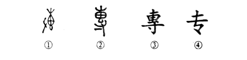 “三十侍中郎,四十專城居。”這個“專”字,原為會意字。甲骨文①的右邊象紡線用的“紡磚”,左邊是一只手,轉動紡磚而紡線。②是小篆的形體,其下的“寸”仍為“手”。③是楷書繁體字。④為草書楷化的簡化字。