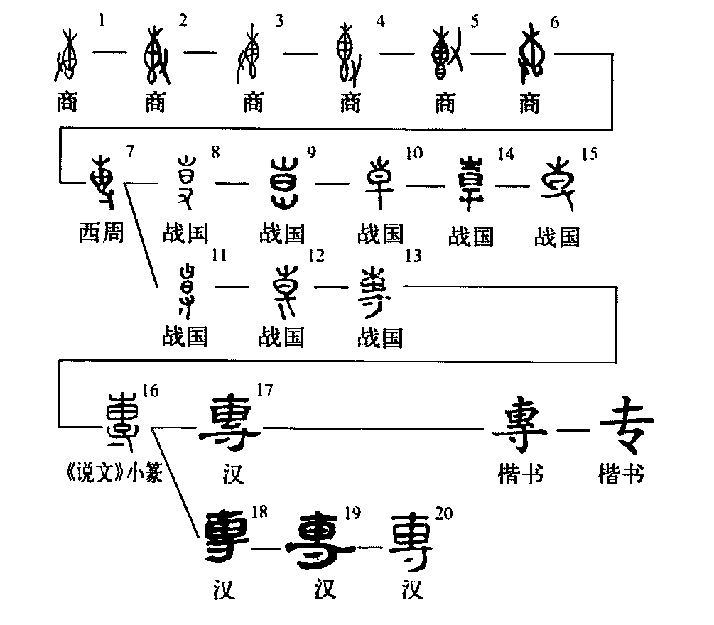 ”、 “鈞”、 “搏”等。 《老子》第十章“專氣致柔”,馬王堆漢墓帛書《老子·道篇》作“槫”(搏)。甲骨文用為三期貞人名、侯伯名、地名。《甲骨續存》 1.1687 :“癸卯卜,專貞:旬亡禍?” 《殷虛書契前編》5.9.2 :“癸亥卜,王貞:余從侯專(我讓侯專跟從嗎)?”《小屯·殷虛文字乙編》811:“貞:乎作圂于專? 勿作圂于專?”通“叀”,相當于語氣詞“惟”。《戰后京津新獲甲骨集》 2243 :“今乙專雨?”通“剸”,截斷。《鐵云藏龜》216.3 :“戊子卜,賓貞:戉其專伐?” (或釋專擅自主)(張標)