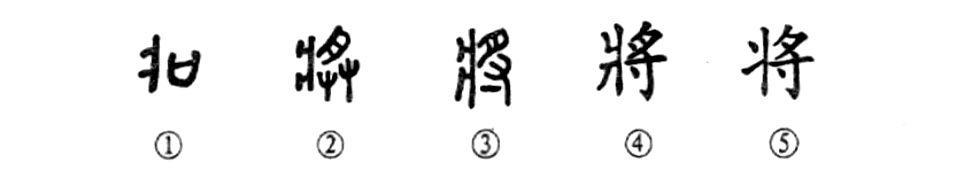 “一車炭重千余斤,宮使驅將使不得。”這個“將”字本為會意字。①是甲骨文的形體,其左為豎起來的“幾案”形(幾腿朝左),右邊是“肉”,表示肉放在幾案上。②是金文的形體,在“肉”下又增加了兩只手,表示雙手捧肉放在幾案之上。③是小篆的形體,兩手變為“寸(手)”,其義未變。④為楷書的繁體字。⑤為簡化字。