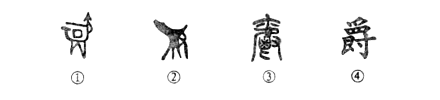 這個“公爵侯爵”的“爵”宇本為象形字。①是甲骨文的形體,就像古代酒器的形狀,下有足,用以溫酒或盛酒,盛行于商代和西周初期。②是金文的形體,更像酒器的形狀,其右邊又增加了一只手。③是小篆的形體,其下部訛變為從“鬯(古代祭祀用的一種酒),變得相當復雜。④是楷書的寫法。