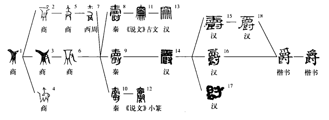 象形字。像爵形。“爵”字在商代已多見,逼肖實物:爵身前有流(傾酒的流槽),后有尖狀尾,杯身下有三足。稍后,杯口上多有柱形“↑”,或在杯側加鋬(pàn,把手)形,或在杯內或流內加短畫以示酒液,或在爵側加手形以示握爵之意。至西周,爵柱形訛作“”形,下體省變為二足。目前,尚未在東周古文字材料中發現“爵”字。在秦并六國前后的秦簡里,“爵”字變異較多,柱形多作“