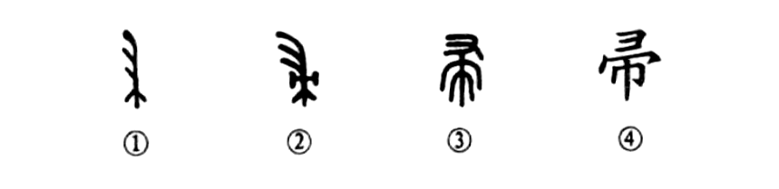 這是“敝帚自珍”的“帚”字,讀zhǒu(肘),是一個象形字。甲骨文①就像一把笤帚,上部的帚苗是掃地的部分,下端是笤帚把兒。金文②的形體更像一把掃炕或掃床的笤帚。小篆③則發生了較大的變化,已經不像笤帚的樣子了,其下部手可握持的部分變成了“巾”字,因此許慎在《說文解字》中把“帚”字放在“巾”部里。其實這“帚”字與“巾”字在詞義上毫無關系。④是楷書的形體,連一點笤帚的模樣兒也沒有了。