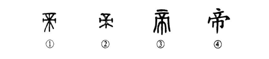 這個(gè)“帝王”的“帝”字是個(gè)象形字。甲骨文①像橫七豎八的一堆木柴,準(zhǔn)備點(diǎn)燃。金文②基本上同于甲骨文。小篆③比甲骨文、金文更復(fù)雜,其下部變成了“巾”,所以姑且將“帝”字放在“巾”部。其實(shí)“帝”字與“巾”字在詞義上并無聯(lián)系,僅是“帝”字的部分形體似“巾”。④是楷書的寫法。