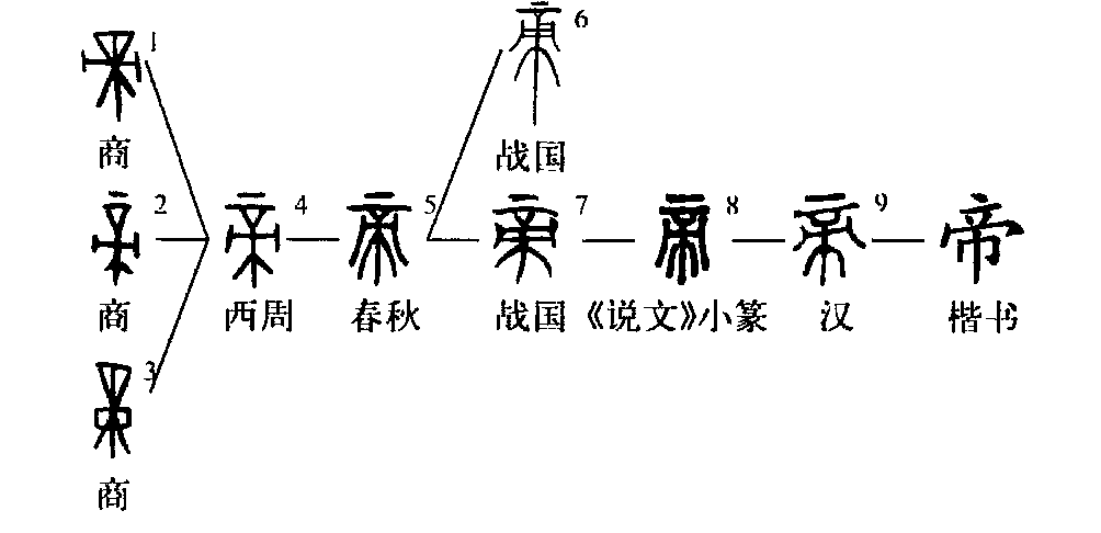 形字。構(gòu)形不明。有學(xué)者認(rèn)為本像花蒂之形,為“蒂”字初文。《說文》則認(rèn)為是從上束聲的形聲字。帝字在甲骨文中已出現(xiàn),多指天帝。《小屯·殷墟文字乙編》6951:“至甲辰帝不其令雨。”(至甲辰這一天,天帝都不會(huì)令下雨)亦可指先王,像帝乙、帝辛、文武帝,都是對(duì)先王的尊稱,所謂德配彼天。人君生而稱帝,當(dāng)自晚周時(shí)開始,《戰(zhàn)國策·趙策三》:“秦之所以急圍趙者,前與齊湣王爭強(qiáng)為帝。”帝字,甲骨文作“”、 “