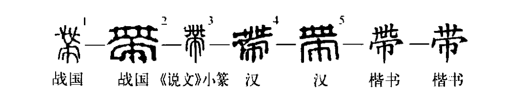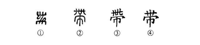 “衣帶漸寬終不悔,為伊消得人憔悴。”這個“帶”字本為象形字。①是金文的形體,上下有纓頭,很像一條兩頭下垂的長帶子,中間呈彎曲形。②是小篆的形體,下部變為“巾”形。③是楷書的繁體字。④為簡化字。