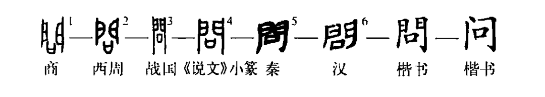 這是“松下問童子”的“問”字。甲骨文①是門內有口,表示在門內發問,這是個會意兼形聲的字。②是戰國印文,與甲骨文相同。③是小篆的形體。④是楷書繁體字。⑤為簡化字。