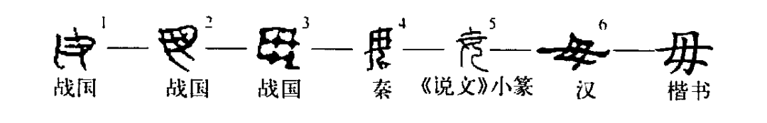女之分化字。從女,中間加一橫筆為分化符號,女亦聲。女、母、毋均一字之分化。戰國時始分化出“毋”字。楚文字“毋”字或作,贅加“