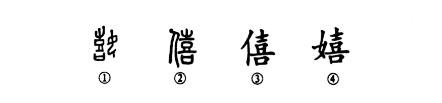 這個“嬉”字本為會意兼形聲的字。①是甲骨文的形體,左邊是“喜”,右邊是面朝左的婦女之形,表示“喜樂”之意。②是小篆的形體,“女”訛變為“人”,并移于“喜”之左,其義不變。③是楷書的寫法。④是隸變后的寫法(古代“人”、“女”互通)。