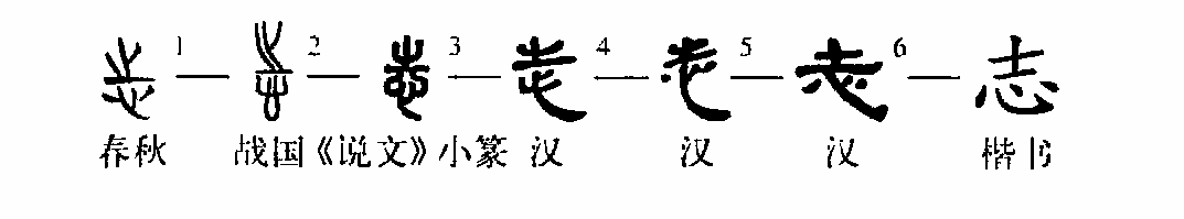 “有志者,事竟成。”這個“志”字是個形聲字。①是古璽文的形體,上部是“之”,表聲;下部是“心”,表形。②是小篆的形體,與璽文形體極相似。③是楷書的寫法。