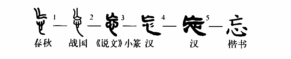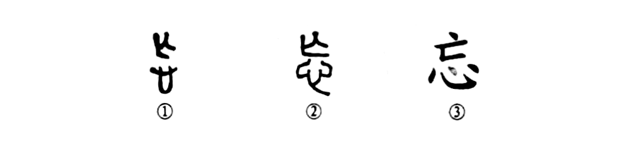 這是“樂而忘憂”的“忘”字,是個會意兼形聲的字。①是金文的形體,上部為“亡(失去)”,下部為“心”,表示亡失了心中記憶之事。其結(jié)構(gòu)應(yīng)為“從亡從心,亡亦聲”。②是小篆的寫法,與金文極相似。③是楷書的寫法。