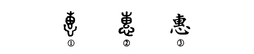 “恩惠及于天下。”這個“惠”字本為會意字。①是金文的形體,上部是“專”的本字,下部為“心”。徐鍇說:“為惠者,心專也。”可見“專心為惠”。②是小篆的形體。③是楷書的寫法。