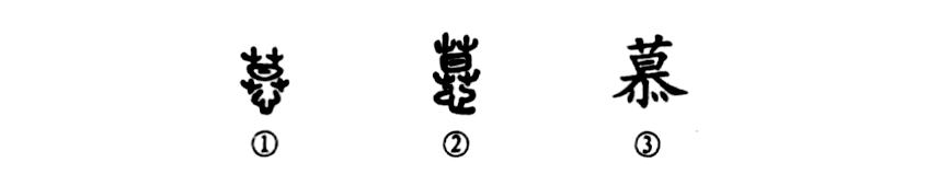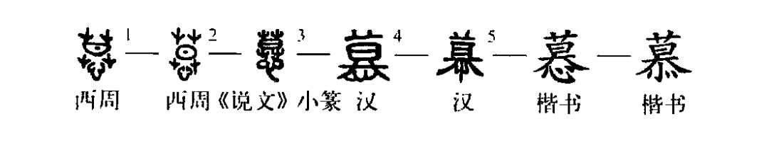 “慕風而就山,慕水而就川?!边@個“慕”字是個形聲字;金文①的上部是個“莫”字,日落草中,表示太陽下山了;其實“莫”就是“暮”字的初文,不過它在“慕”字中只表讀音,而下部的“心”字才是表意的。這樣,“慕”字就成了上聲(莫)下形(心)的形聲字了。②是小篆的形體,與金文的結構完全一致。③是楷書的寫法?!靶摹弊秩缭谝粋€字的下部,有時寫作“”,除了“慕”字以外還有“恭”字。從筆畫的數目上看,“心”與“”均為四筆,只是筆形上有些差異。