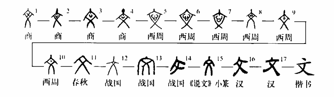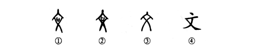 這個(gè)“文”字是個(gè)象形字。像什么呢?像一個(gè)心寬體胖的壯年人。你看甲骨文①就像正立的人形。最上端是頭,向左右伸展的是兩臂,下部是兩腿,胸前刻有美觀的花紋。金文②的形體基本上同于甲骨文,胸前的花紋更好看了。小篆③則把胸前的花紋省略了。④是楷書的形體,一點(diǎn)也看不出“人”形了。