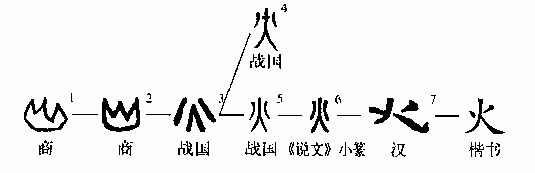 象形字。像物體燃燒時發(fā)出的光、焰之形。本義是火、火焰。《合集》2874:“丙寅卜,??貞:其有火? ”(丙寅日占卜,??貞:會有火?)《合集》 11503:“有新大晶(星)並火。”可能指的是火星。《書·盤庚上》:“若火之燎于原,不可向邇(靠近),其猶可撲滅?”《韓非子·五蠹》:“有圣人作,鉆燧取火,以化腥臊。”“火”的引申義較多,由火焰引申為著火、火災(zāi)等義,由火焰又可引申為火把、火炬、火藥、槍炮彈藥等義,由火的顏色可引申為火紅色,由火的旺盛引申為興旺或暴躁、怒氣,由著火、火災(zāi)的刻不容緩引申為緊急,茲不詳述。火可以取暖,又可以照明,尤其可以燒烤食物,使生食轉(zhuǎn)為熟食,使人類卓然超越于其他動物之上,向文明社會挺進(jìn)。甲骨文字形像物體燃燒時光、焰迸射之形;戰(zhàn)國文字將火形拆成了四筆,但還保留了一點光、焰上冒的樣子;其后的字形與戰(zhàn)國文字一脈相承。(郭小武葉青)