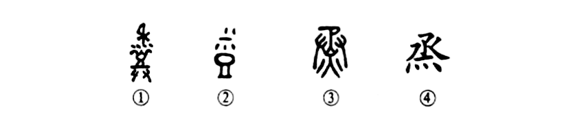 《周禮》:“以烝,冬享先王。”這個“烝”字本為會意字。甲骨文①的上部為“禾”,屮間為禾米盛于“豆(食器)”中,下部是一雙手表示祭祀。②是金文的形體,省去了“禾”與雙手,只是豆中有米。③是小篆的形體,上部變為“丞”,下部增加了“火”。④為楷書的寫法。