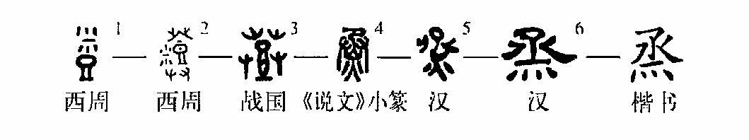 (雙手),登聲。因“登”字中有“豆”形,故從“登”聲者亦可認為兼取“豆”的意象,即從雙手持豆以會進獻祭品意。小篆演變為上“丞”、下“火”的形聲字;隸楷文字由小篆演變而來,寫作“烝”。(郭小武葉青)