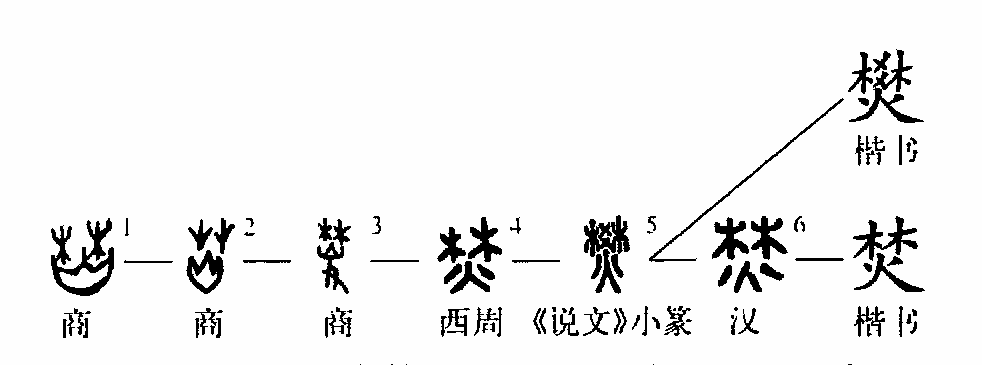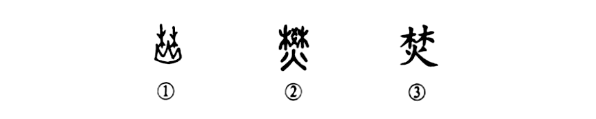 “地火峰林焚”的“焚”字也是個會意字。甲骨文①的上部是樹林,下部有一把大火(“山”字形),火燒山林謂之“焚”。②是小篆的形體,上部像“籬笆”之形,下部是“火”,仍然表示焚燒之義。到了楷書③又恢復了甲骨文的結構,書寫也比小篆方便。