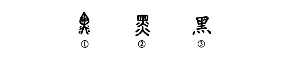 “滿面灰塵煙火色,兩鬢蒼蒼十指黑。”這個“黑”字是個會意字。金文①的上部表示像煙囪形,當中的黑點兒是表示煙囪里面的黑灰,下部是個“炎”字。這就是說,在燒火時,把煙囪里面都熏黑了。②是小篆的形體,與金文的形體基本相似。③是楷書的寫法,把小篆的“火”變成了四個點兒了。在漢字中,凡是有“四點底”的字大都是“火”字變來的,這是為了結構美觀,書寫方便。