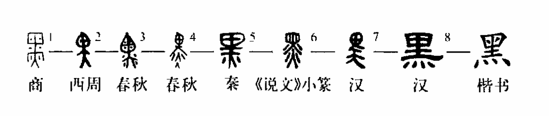 會意字。從炎,從囪形,會火焰升騰從煙囪出煙之意。甲骨文、金文上部像內有黑灰的煙囪形,下部為“火”或“炎”;小篆與甲骨文、金文形體大致相同,上為煙囪,下為疊火的“炎”;隸楷文字將小篆“炎”的上一火變成了“土”,下一火變成了“灬”。本義為熏黑之色。《說文》:“黑,火所熏之色也。”《合集》29544:“惟黑犬,王受有祐。”意思是問用黑色的犬,王會不會受到保佑。泛指像煤或墨的顏色。《詩·邶風·北風》:“莫赤匪狐,莫黑匪烏。”(沒有狐貍毛不紅,沒有烏鴉羽不黑)由熏黑之色引申為黑暗,由黑暗引申為秘密的、隱蔽的,由秘密的、隱蔽的引申為惡、壞、反動的。(郭小武 葉青)