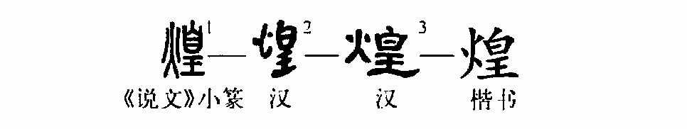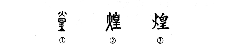 這是“煌煌熒熒”的“煌”字,本為象形字。①是金文的形體,燈上有火形,表示“明亮”之意。②是小篆的形體,變成了“從火,皇聲”的形聲字了。③是楷書的寫法。