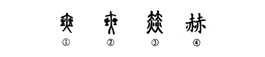 這是“戰功赫赫”的“赫”字,本為會意字。①是甲骨文的形體。羅振玉和商承祚等先生都認為這是個“(赫)”字,中間為“人”形,兩側有“火”,照得人身火紅。②是金文的形體,與甲骨文相似。③是小篆的寫法。④為楷書的寫法。